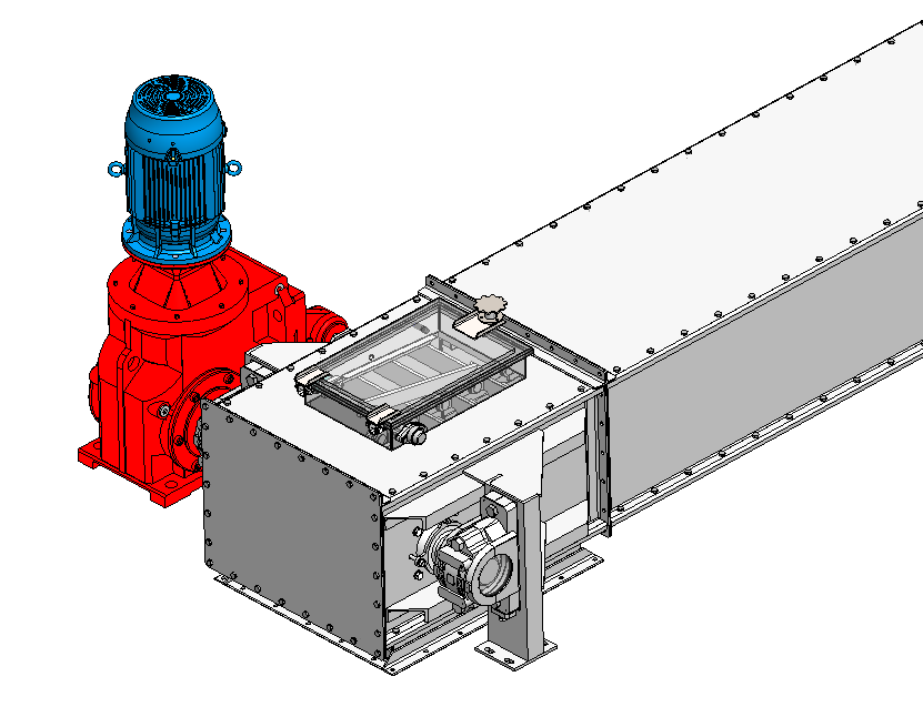 Additionally, the conveyor is equipped with protective skirt plates to shield the chain from bulk material, prolonging chain life. Maintenance is made easy with inspection and lubrication hatches on each structural section. A manual screw take-up ensures consistent chain tensioning, while bumper beams with low-friction liners support high-impact areas. These features, combined with a chain and sprocket drive mechanism, ensure reliable and efficient operation for diverse industrial needs.