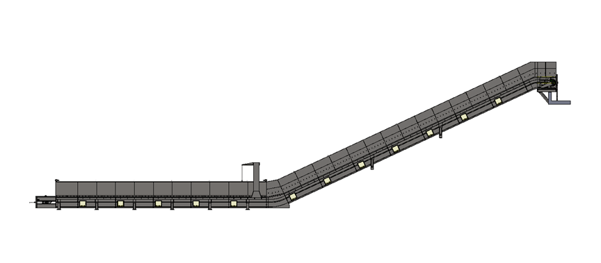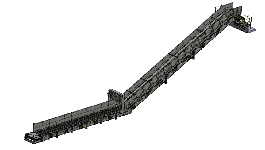 Designed with an inclined head section, the conveyor features lifter bars on the steel slats to prevent material rollback at higher angles. This configuration optimizes machine length while achieving the necessary discharge height. The hydro-mechanical drive system is particularly suited for applications requiring frequent start/stop operations, with an option for variable speed control through modifications to the hydraulic power unit.